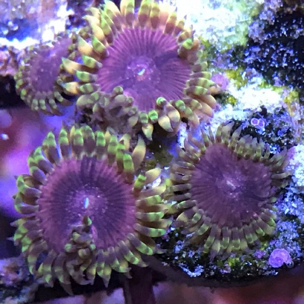 Speckled black purple disk, white mouth with radioactive green skirts.