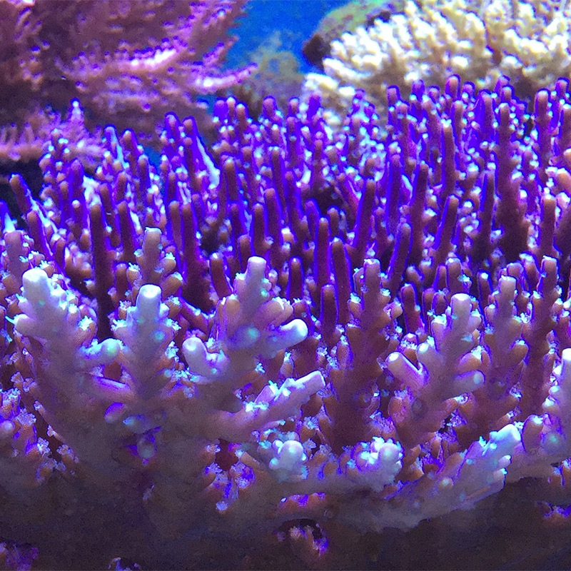The captain planet acro has a blue and reddish colored base turning to bright green tips. Great staghorn has long blue branches with light blue tips. This coral does best with moderate to strong lighting and flow.