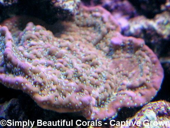 Copps rainbow undata is a truly stunning coral. It is a smooth encrusting montipora similar to the Tyree true undata. The body of this coral is light green except for the growing edge which is bright purple. The polyps of this coral are orange. We recommend keeping this coral under moderate lighting and moderate flow.