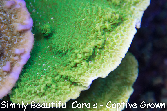 Montipora capricornis is a plating stony coral also referred to as Leaf Plate coral and Vase coral. This coral has a bright green and can grow in a variety of interesting plating growth forms. M. capricornis is one of the easier sps corals to keep and is capable of very rapid growth. It prefers moderate lighting and water flow.
