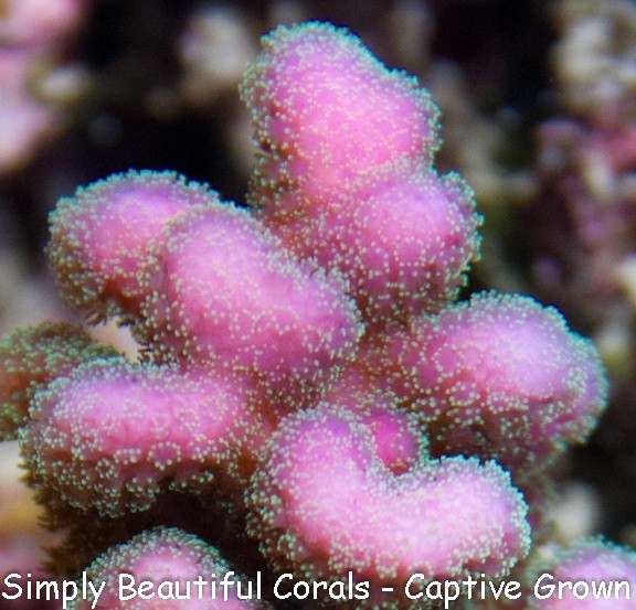 The Steve Garret stylo is a stunningly beautiful stylophora with florescent green polyps on a purple/pink base.