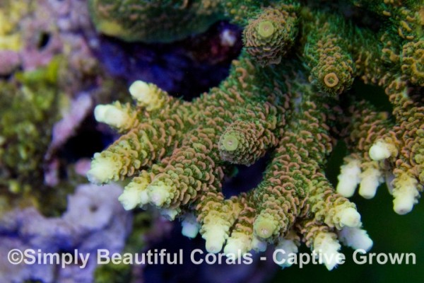 This beautiful millepora is pink and yellow with yellow tips. This millepora prefers moderate to high light and water flow.