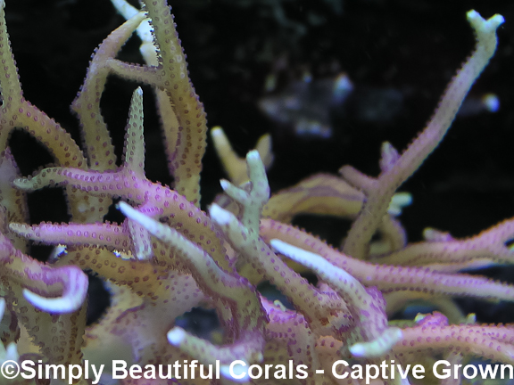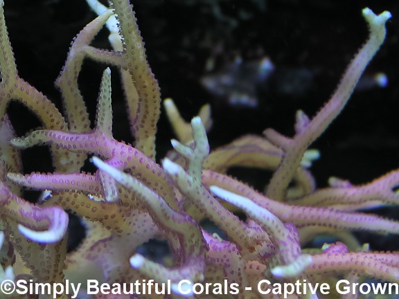 The Hyacinth Birdsnest is a very fragile branched coral. It is pink in coloration with blue/purple polyps that end in a white growth tip. While this coral is very fragile it is a quick grower so any broken tips can grow back very quickly.