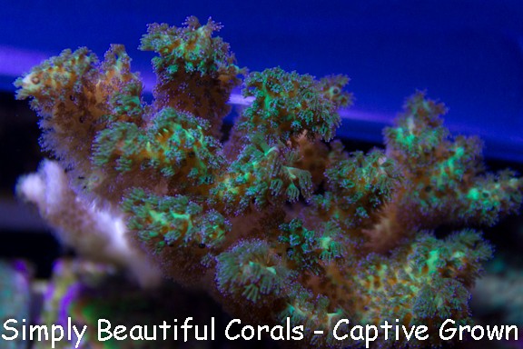 Lemon/lime colored base with bushy green/blue polyps. Quite different from other pocillipora colors and polps.