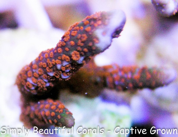 This is a branching species of Montipora that is bright red polyps on a tan base with white tips on the end of the branches. M. Digitata prefers moderate light and moderate flow. Similar to the purple digitata we sell this is a rapid growing, hardy, attractive SPS coral that is a great addition whether you are experienced with SPS or just starting out.