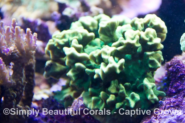 Bright, if not neon, green coral with an unusual wavy structure which stands out from the normal branching and encrusting corals.